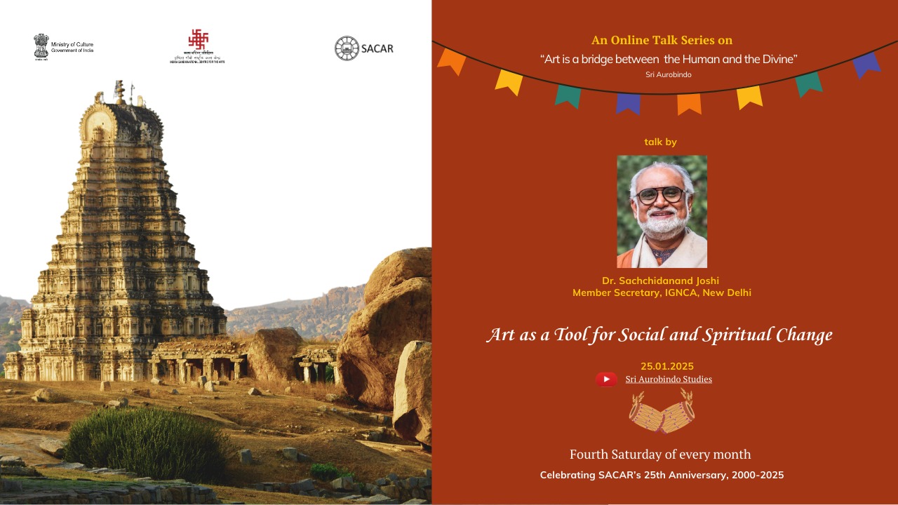 साधना जीवन की दिशा और उद्देश्य को निर्धारित करने का एक अनुशासित प्रयास है। इस यात्रा को सफल बनाने के लिए कुछ आवश्यक तत्व या उपादान महत्वपूर्ण भूमिका निभाते हैं। इनमें निश्चित लक्ष्य, श्रद्धा, अनुशासन, धैर्य, निरंतर प्रयास, उपयुक्त वातावरण और समर्पण प्रमुख हैं। ये उपादान साधना को न केवल सफल बनाते हैं, बल्कि आत्म-ज्ञान और आंतरिक संतुलन की ओर भी मार्गदर्शन करते हैं। यह वीडियो आपको इन उपादानों की गहराई और उनके जीवन में महत्व को समझने में मदद करेगा। साधना की इस श्रृंखला में जुड़े रहें और अपने जीवन को एक नई दिशा दें। In his cultural writings, Sri Aurobindo wrote: “Spirituality is indeed the master key of the Indian mind”. It is an interesting statement which demands deep contemplation and substantiation. A new talk will be released on the 3rd Saturday of every month from 6am onwards. This series of talks will explore the theme “Art is bridge between the human and the divine” – a profound vision of Sri Aurobindo. Various scholars, basing themselves on Sri Aurobindo’s writings on Art and Culture deliberate upon this topic and substantiate this vision of the yogi. A new talk will be released on the 4th Saturday of every month from 6am onwards. Second Series in Auro Talks: A Govt. Sponsored series of talks which invited scholars to search common points between Sri Aurobindo and the World thinkers. About 12 scholars came forward to write the papers and about nine gave their interviews on the topics they had chosen. You Tube